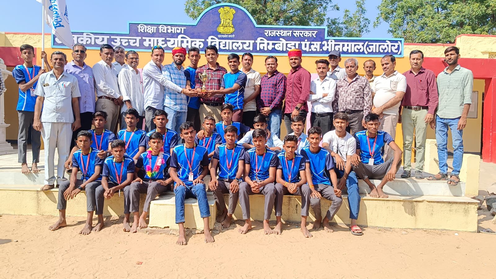 भीनमाल/निंबोड़ा। प्रधानाचार्य नारायण लाल जीनगर ने बताया की जालोर जिला स्तरीय कबड्डी प्रतियोगिता का अयोजन राउमावि कवराड़ा आहोर में हुआ जिसमें सीनियर वर्ग व जुनियर वर्ग दोनों में निंबोड़ा की टीम ने भाग लिया, सीनियर टीम ने अपने पांचवे व फ़ाइनल मैच में बावतरा को 61-40 से हराकर फाइनल विजेता बनी व जुनियर टीम अपने 2 मुकाबले जीत कर क्वार्टर फ़ाइनल में हार गई टीम के कोच व प्रभारी श्री तेजाराम जाखड़ ने बताया की 7 खिलाड़ियों का राज्य पर चयन हुआ जिसमें 2 जुनियर वर्ग में तथा 5 सीनियर वर्ग में सीनियर वर्ग में बेस्ट राइडर का पुरस्कार निंबोड़ा टीम के विपुल कुमार को दिया गया, टीम आज कप्तान हितेष सिंह के तथा नेशनल प्लेयर अशोक चौधरी के नेतृत्व में विद्यालय लौटने पर समस्त ग्रामवासियों ने डीजे के माध्यम से स्वागत किया व विद्यालय परिवार के मुखिया प्रधानाचार्य जीनगर द्वारा प्रभारी तेजाराम, प्रशिक्षक अशोक चौधरी ,शारीरिक शिक्षक दिनेश बिश्नोई व दोनो टीम का साफा माला से स्वागत किया गया इस अवसर पर उपप्रधानाचार्य श्री उदय राज, श्री प्रकाश कुमार ,श्री पाबूराम , श्री खीमाराम , श्री पुष्पेन्द्र कुमार वाजपेई, श्री शंभू सिंह, श्री लाडू राम मांजू,श्री विनोद कुमार दवे, श्री रेवाराम पुरोहित, श्री विक्रम सिंह, श्री खेताराम, श्री पोपट राम व सैकड़ों की संख्या में ग्रामीण उपस्थित रहें।
