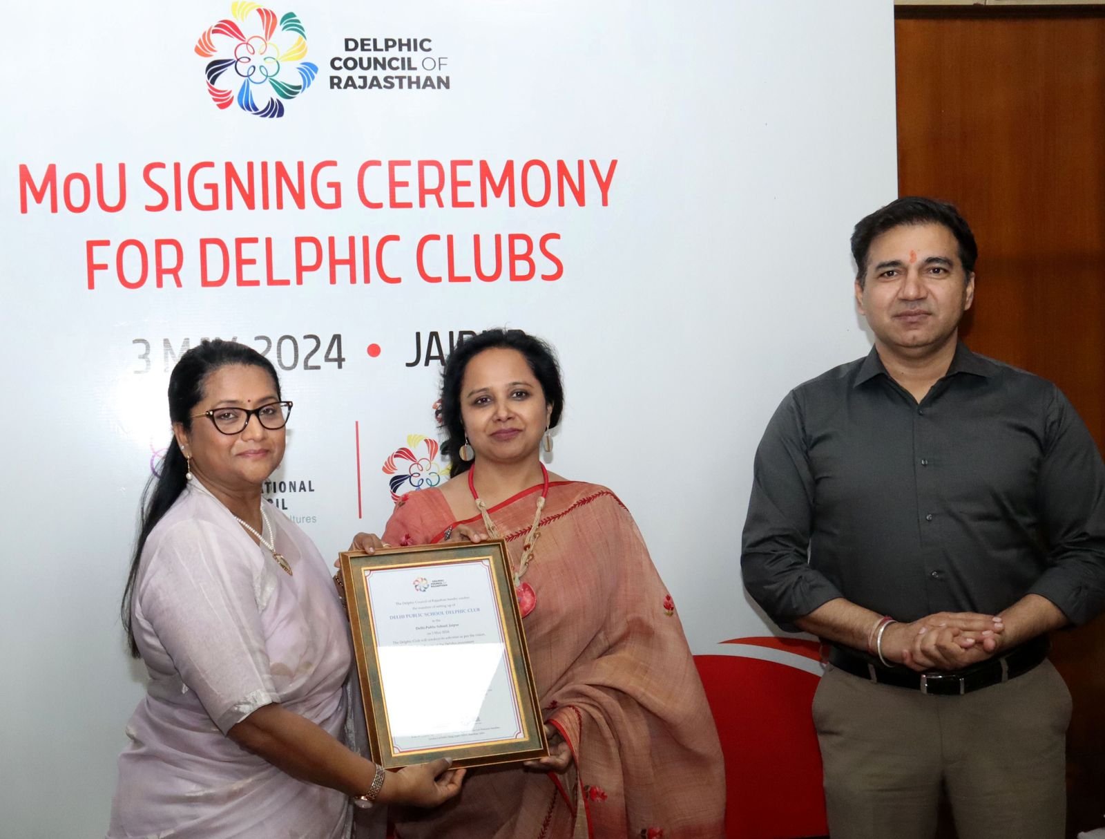 डेल्फिक काउन्सिल ऑफ राजस्थान एवं विद्यालयों के मध्य एमओयू, प्रदेश में बनेंगे चार और डेल्फिक क्लब, कला एवं संस्कृति के लिये युवाओं को मिलेगा जीवंत मंच।             जयपुर – प्रदेश में कला और संस्कृति को बढावा देने के लिए डेल्फिक काउन्सिल ऑफ राजस्थान एवं चार विद्यालयों के मध्य शुक्रवार को एमओयू पर हस्ताक्षर हुए। डेल्फिक काउन्सिल ऑफ राजस्थान की अध्यक्ष श्रीमती श्रेया गुहा ने बताया कि डेल्फिक आन्दोलन से छः डेल्फिक कलाओं (शास्त्रीय संगीत, भारतीय फ़िल्म संगीत, लोकप्रिय संगीत, शास्त्रीय नृत्य, लोक नृत्य, समकालीन नृत्य, फोटोग्राफी) के प्रति युवाओं की भागीदारी को बढाने के उद्देश्य से एमओयू पर हस्ताक्षर किए गये है। इससे प्रदेश में डेल्फिक आन्दोलन को गति मिलेगी। और छात्रों को कला व संस्कृति के प्रदर्शन के लिए एक मंच मिल सकेगा।श्रीमती गुहा ने बताया कि डेल्फ़िक काउंसिल ऑफ़ राजस्थान भारतीय डेल्फ़िक काउंसिल और इंटरनेशनल डेल्फ़िक काउंसिल का एक हिस्सा है, जो युवाओं को अतंर्राष्ट्रीय स्तर पर मंच प्रदान करने कि दिशा में कार्य कर रही है, काउंसिल द्वारा इन विद्यालयों के साथ वार्षिक कैलेंडर तैयार कर डेल्फिक गेम्स का आयोजन किया जावेगा। उन्होने इसके लिए विद्यालयों स्तर पर नोडल अधिकारियों को नियुक्त करने के निर्देश दिए।कार्यक्रम में डेल्फिक काउन्सिल ऑफ राजस्थान की तरफ से काउन्सिल के महासचिव श्री जितेन्द्र कुमार सोनी (आई.ए.एस.) ने एवं द पैलेस स्कूल जयपुर, गवर्नमेन्ट सीनियर सैकेण्डरी स्कूल किशनगढ, दिल्ली पब्लिक स्कूल और विद्याश्रम स्कूल ने एमओयू पर हस्ताक्षर किए।इस अवसर पर डेल्फिक काउन्सिल ऑफ राजस्थान के सदस्य सुश्री कीर्ति शर्मा, मोनाली सेन (आईएफएस), सुश्री शिप्रा शर्मा, आरएएस (कोषाध्यक्ष), श्री नवीन त्रिपाठी, श्री राहुल सूद, श्री शुवंकर विश्वास, सुश्री शबाना डागर, डॉ. दिनेश कुमार राणा एवं विद्यालयों के प्रतिनिधि मौजूद रहें।(1234)