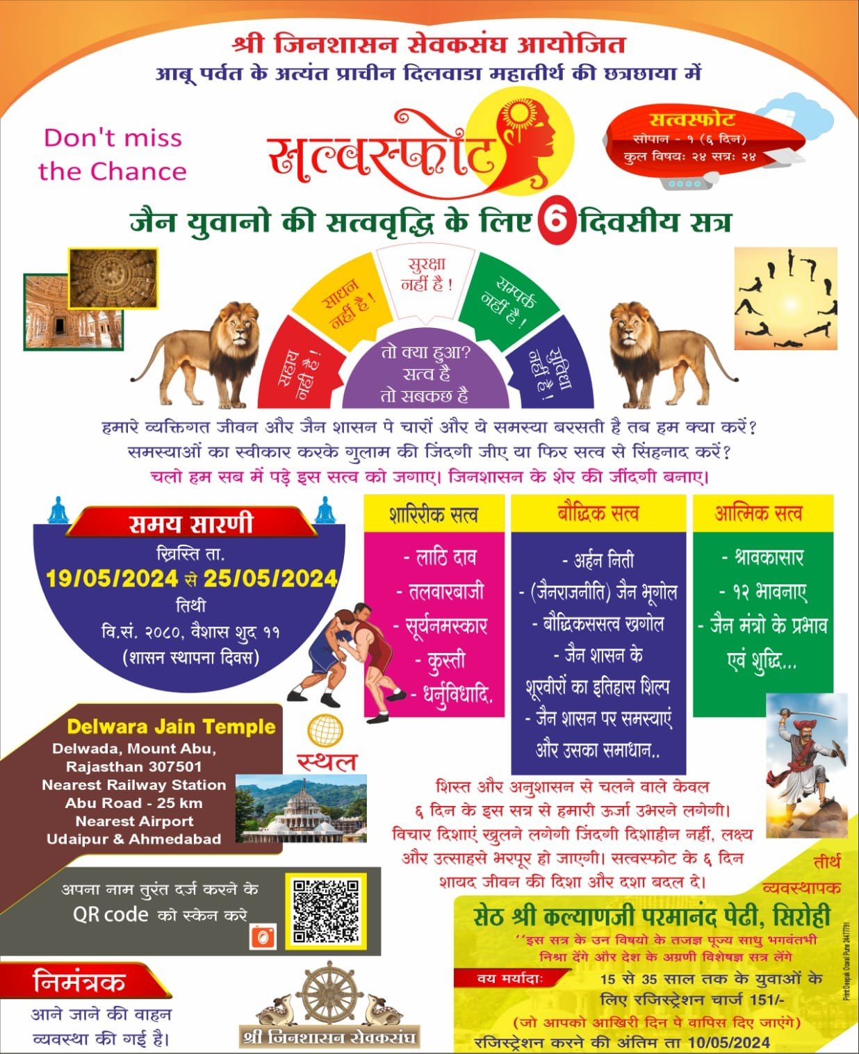 सत्वस्फोट शिविर,माउंटआबू में जैन शासन में एक अभिनव प्रयोग,सब कुछ निःशुल्क,आज ही रजिस्ट्रेशन करवाएं।