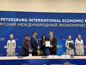 New delhi-The Global Trade & Technology Council of India (GTTCI) is delighted to announce the signing of a Memorandum of Understanding (MOU) with the Roscongress Foundation at the St. Petersburg International Economic Forum (SPIEF) 2024 on 6th June 2024 at St. Petersburg, Russia. This significant agreement marks a milestone in strengthening bilateral trade, investment, and cultural ties between India and Russia.Dr. Rashmi Saluja, Chairperson of GTTCI, exchanged the MOU with Mr. Alexey Valkov, Deputy CEO of the Roscongress Foundation, in a ceremony that underscored the mutual commitment to fostering deeper economic and cultural connections. The event was further graced by the presence of Dr. Gaurav Gupta, Founder and President of GTTCI, and Mr. Rakesh Asthana, Chief Advisor of GTTCI, who engaged in productive discussions with the Roscongress delegation.