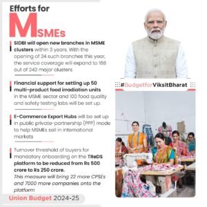 केंद्रीय वित्त मंत्री ने प्रस्ताव किया कि एमएसएमई और पारंपरिक कारीगरों को अंतर्राष्ट्रीय बाजारों में अपने उत्पाद बेचने में सक्षम बनाने के लिए सार्वजनिक-निजी भागीदारी (पीपीपी) मोड में ई-कॉमर्स निर्यात केंद्र स्थापित किये जाएंगे। केंद्रीय वित्त मंत्री ने कहा कि एक निर्बाध विनियामक और लॉजिस्टिक फ्रेमवर्क के अंतर्गत ये केंद्र एक छत के नीचे व्यापार और निर्यात संबंधी सेवाओं की सुविधा प्रदान करेंगे।
