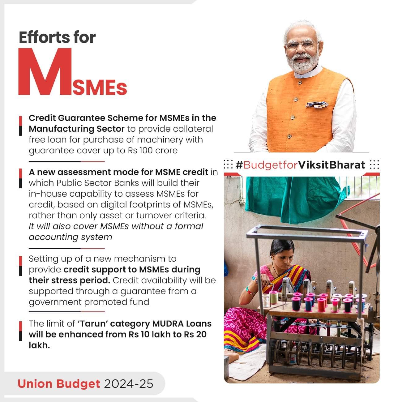 नई दिल्ली-केन्द्रीय वित्त एवं कॉरपोरेट कार्य मंत्री श्रीमती निर्मला सीतारमण ने आज संसद में ‘केन्द्रीय बजट 2024-25’ पेश करते हुए कहा, “इस बजट में एमएसएमई और विनिर्माण विशेष रूप से श्रम के ज्यादा इस्तेमाल वाले विनिर्माण पर विशेष ध्यान दिया गया है।” केन्द्रीय वित्त मंत्री ने कहा कि सरकार ने एमएसएमई के लिए वित्त पोषण, नियामकीय बदलावों और प्रौद्योगिकी समर्थन को ध्यान में रखते हुए एक पैकेज तैयार किया है। अंतरिम बजट में उल्लेख किया गया है कि इससे एमएसएमई को आगे बढ़ने और वैश्विक स्तर पर प्रतिस्पर्धा करने में सहायता मिलेगी।सूक्ष्म, लघु एवं मध्यम उपक्रम (एमएसएमई) बजट में चार मुख्य थीम का हिस्सा हैं और केन्द्रीय वित्त मंत्री ने एमएसएमई के समर्थन में निम्नलिखित विशेष कदमों का प्रस्ताव किया हैः