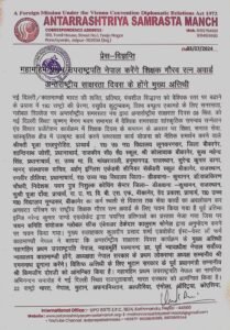 ईराक, इजराईल, मैकङोनिया, मोरक्को, नीदरलैण्ड, नाईजीरिया, नार्वेजियन, रोमानिया, रायल डेनिश, श्रीलंका, मालदीव का नैतिक समर्थन राष्ट्र के राष्ट्र ध्वजो का समारोह में सानिध्य रहेगा। वैश्विक समरसता सांस्कृतिक समन्वय सम्मेलन का मुख्य उद्देश्य:- भारत-नेपाल की वैदिक कालीन संस्कृति का पुर्न उत्थान हो, भारत पुनः वैदिक कालीन जगत गुरू के आसन पर पद् स्थापित हो, भारत को संयुक्त राष्ट्र संघ की सुरक्षा परिषद् में विटो पावर के साथ स्थाई सदस्यता मिले, अयोध्या को संयुक्त राष्ट्र संघ का मुख्यालय बनाया जावे कार्य योजना को सम्मानिय शिक्षक, श्रीमती पूजा राजपुरोहित, शान्तिनाथ जोशी, सुख महेन्द्र सिंह, सुरेन्द्र कुमार डागा, रणवीर ठौलिया, डॉ.राजकिरण चौधरी, सुश्री पूजा दाँवा, वेद प्रकाश ने अपना नैतिक समर्थन प्रदान किया है। स्वः पोषित वित्तिय व्यय योजना के अन्तर्गत चयनित प्रतिभाओ को दिसम्बर में काठमाण्डौ नेपाल में भारत रत्न पूर्व प्रधानमंत्री स्व: श्री अटल बिहारी वाजपेई की जयन्ती समारोह के लिए आमंन्त्रित किया जायेगा।