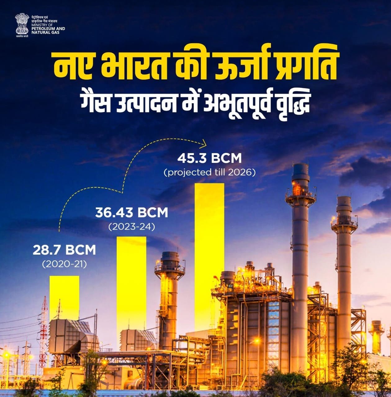 नई दिल्ली-प्रधानमंत्री श्री नरेन्द्र मोदी ने गैस उत्पादन के क्षेत्र में आत्मनिर्भरता की दिशा में एक नया कीर्तिमान स्थापित करने के लिए देशवासियों को बधाई दी है। श्री मोदी ने कहा कि विकसित भारत के संकल्प की सिद्धि में ऊर्जा के क्षेत्र में आत्मनिर्भरता बहुत महत्वपूर्ण है।केंद्रीय पेट्रोलियम एवं प्राकृतिक गैस मंत्री श्री हरदीप सिंह पुरी ने एक एक्स पोस्ट में बताया कि देश ने गैस उत्पादन के क्षेत्र में नया कीर्तिमान स्थापित किया है। वर्ष 2020-21 में गैस उत्पादन 28.7 बीसीएम था। वर्ष 2023-24 में इसे बढ़ाकर 36.43 बीसीएम कर दिया गया है। केंद्रीय मंत्री द्वारा साझा किए गए आंकड़ों के अनुसार वर्ष 2026 में गैस उत्पादन 45.3 बीसीएम हो जाएगा।केंद्रीय मंत्री के एक्स पोस्ट के जवाब में प्रधानमंत्री ने कहा; “देशवासियों को इस उपलब्धि के लिए बहुत-बहुत बधाई!