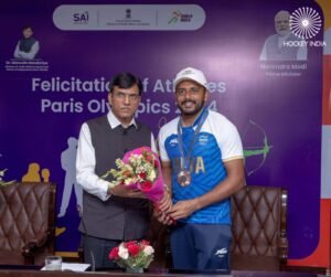 New Delhi -Union Minister of Youth Affairs and Sports, Dr. Mansukh Mandaviya, felicitated the Indian Hockey Team for their remarkable achievement in securing the bronze medal at the Paris 2024 Olympics in New Delhi today.Dr. Mandaviya commended the team’s dedication and hard work, noting that their outstanding performance on the global stage has filled the entire nation with pride.“The entire nation is proud of your achievement,” Dr. Mandaviya stated. “This victory is a testament to your perseverance, teamwork, and indomitable spirit. You have brought immense glory to India and have inspired millions of young athletes to pursue their dreams,” he added.Union Minister also acknowledged the tireless efforts of the coaching staff and support team, recognizing their crucial role in the team’s success. He reiterated the government’s commitment to providing all necessary support to further develop hockey in India and nurture the country’s sporting talent.“Hockey is more than just a sport for us—it’s a symbol of our national pride.