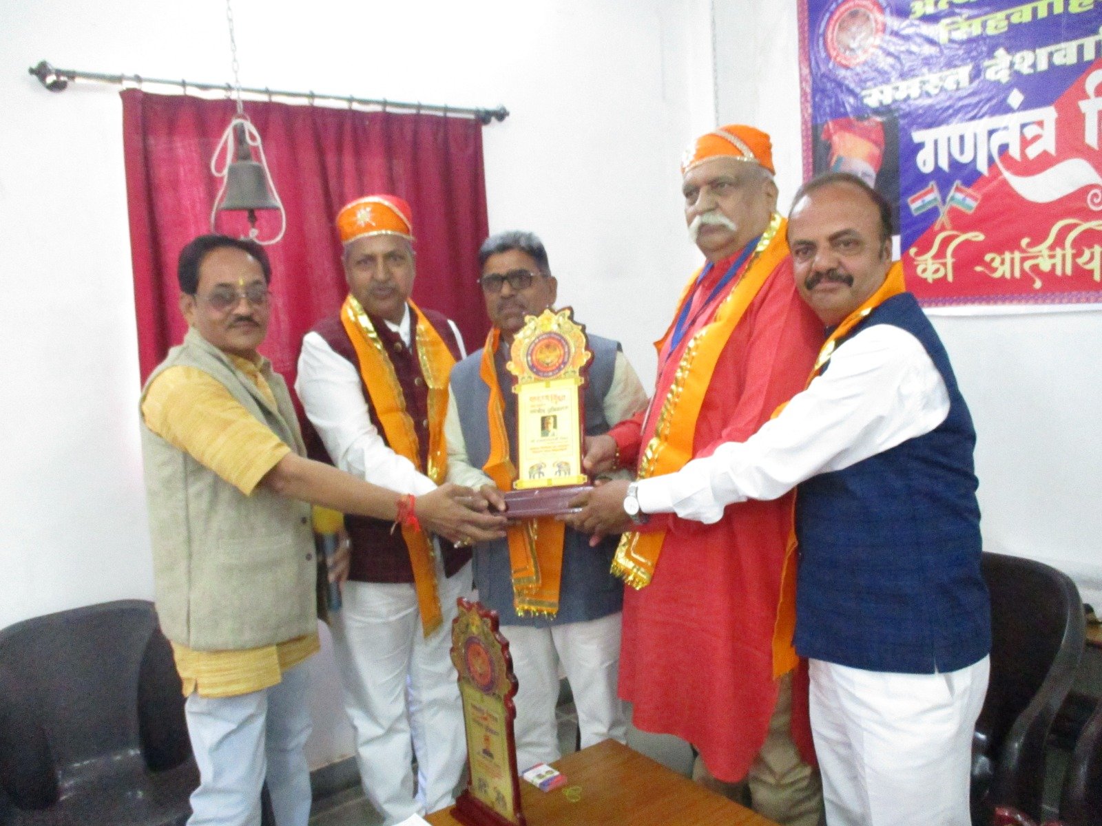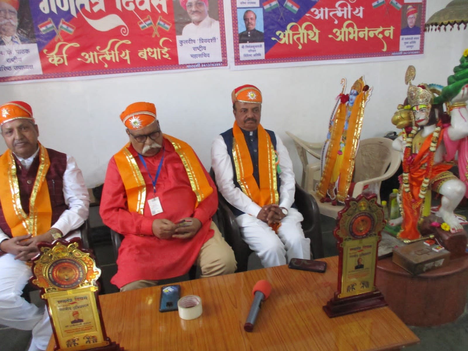 उदयपुर-भ्रष्टाचार निरोधक एवं अत्याचार निवारण न्यास, सिंहवाहिनी द्वारा एम. के. पाठक की अध्यक्षता, समाजसेवी निर्मलकुमार पण्डित के विशिष्ट आतिथ्य एवं राकेश बंसल के मुख्य आतिथ्य में 26 जनवरी 2025 के उपलक्ष्य में सिंहवाहिनी कार्यालय महाकाली शक्तिपीठ, हिरण मगरी सेक्टर-5 उदयपुर पर गणतन्त्र दिवस समारोह विविध कार्यक्रमों के साथ समारोहपूर्वक मनाया गया ।जिलाध्यक्ष राजेश चैहान ने ने जानकारी देते हुए बताया कि प्रातः 11 बजे एम. के. पाठक, निर्मलकुमार पण्डित एवं राकेश बंसल द्वारा विधिवत झण्डारोहण किया गया । पश्चात् समारोह का आयोजन राष्ट्रीय उपाध्यक्ष विशिष्ट अतिथि एवं मुख्य अतिथि द्वारा दीप प्रज्वलन एवं माल्यार्पण कर किया गया । अतिथि देवोभव की परम्परा के अन्तर्गत निर्मलकुमार पण्डित एवं राकेश बंसल का तिलक, उपरणा, मेवाड़ी पगड़ी एवं प्रतीक चिन्ह प्रदान कर अभिनन्दन किया गया । समारोह में श्यामलाल पँवार, रमेश बारबर, पिंकी माली, नन्हीं बालिका स्वरा वर्मा, उविश जायसवाल, गणेश माली, बंशीलाल राव, दिलीप कुमावत आदि ने देशभक्ति गीत से ओतप्रोत वक्तव्य एवं गीत सुनाकर सभी का मन मोह लिया ।