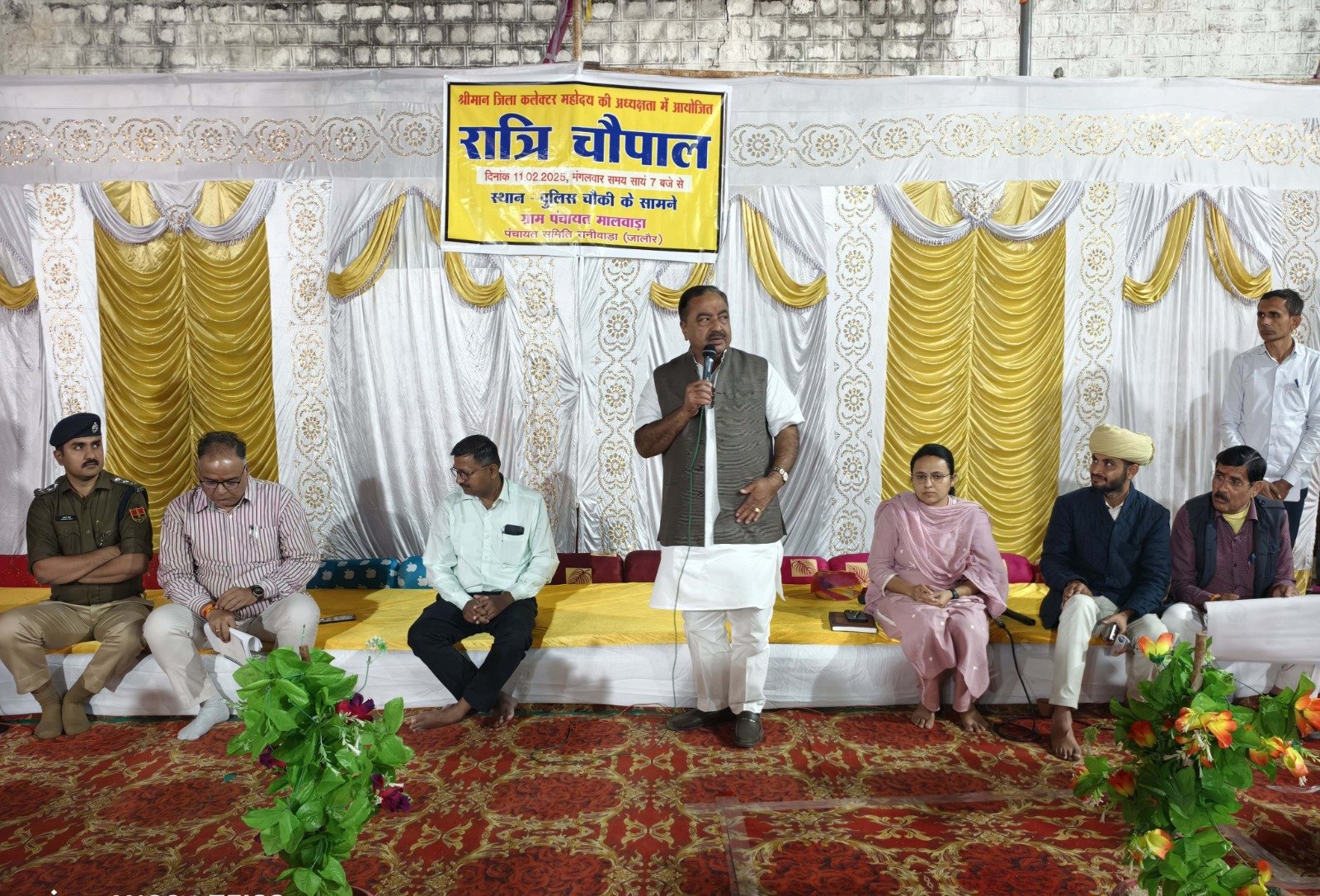 मालवाड़ा/रानीवाड़ा –12 फरवरी। जिला कलक्टर डॉ. प्रदीप के. गावंडे ने मंगलवार को रानीवाड़ा उपखण्ड के मालवाड़ा ग्राम में रात्रि चौपाल कर उपस्थित ग्रामीणों की समस्याओं को सुनते हुए उनका मौके पर ही निस्तारण किया।रात्रि चौपाल के दौरान जिला कलक्टर डॉ. प्रदीप के. गावंडे के समक्ष ग्रामीणों ने अतिक्रमण हटाने, विद्युत व पानी की समस्या का समाधान करने सहित विभिन्न परिवाद प्रस्तुत किए जिनको जिला कलक्टर ने गंभीरतापूर्वक सुनते हुए उनका मौके पर ही निस्तारण करवाने के लिए संबंधित विभागीय अधिकारियों को निर्देशित किया।चौपाल में रानीवाड़ा के पूर्व विधायक नारायणसिंह देवल ने कहा कि रात्रि चौपाल के दौरान प्रस्तुत की समस्याओं का प्रशासन द्वारा शीघ्र ही समाधान किया जाएगा। उन्होंने कहा कि क्षेत्र में विद्युत समस्या के समाधान के लिए शीघ्र ही राजपुरा में 132 केवी जीएसएस प्रारंभ हो जाएगा तथा राज्य सरकार द्वारा बजट घोषणा के अंतर्गत करड़ा में 220 केवी जीएसएस भी स्वीकृति किया है। उन्होंने सामाजिक सुरक्षा पेंशन योजनान्तर्गत वृद्धावस्था, विधवा व दिव्यांगजन पेंशनर्स वार्षिक सत्यापन करवाए जाने की बात कही। पूर्व विधायक ने जल जीवन मिशन के तहत प्रत्येक घर को नल कनेक्शन से जोड़ने की बात कही।रात्रि चौपाल में सामाजिक न्याय एवं अधिकारिता विभाग,