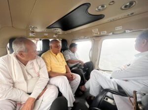 साथ में चिकित्सा मंत्री श्री परसादी लाल मीणा, स्वायत्त शासन मंत्री श्री शांति धारीवाल, गोपालन मंत्री श्री प्रमोद जैन भाया, विधायक श्री रामनारायण मीणा एवं श्री भरत सिंह ने हेलीकॉप्टर से बाढ़ प्रभावित क्षेत्रों का अवलोकन किया।