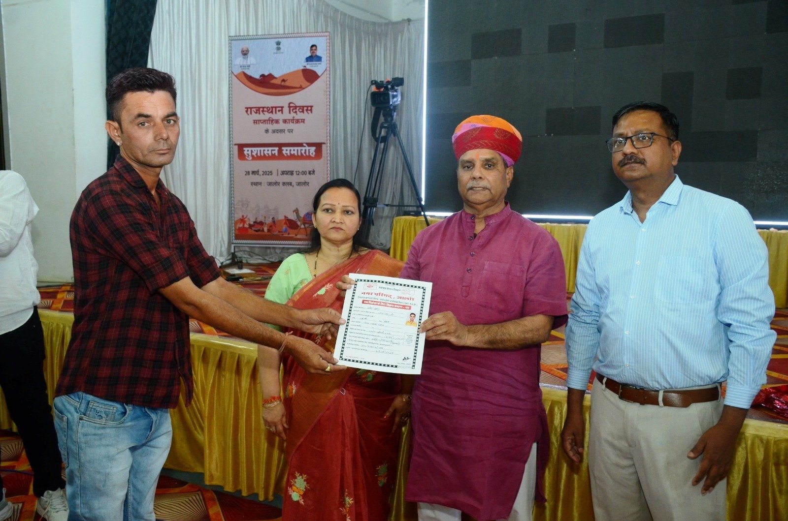 जालोर 28 मार्च। राजस्थान दिवस के उपलक्ष्य में प्रदेशभर में साप्ताहिक महोत्सव के तहत विभिन्न कार्यक्रम आयोजित किए जा रहे हैं। इसी क्रम में मुख्यमंत्री श्री भजनलाल शर्मा शुक्रवार को भीलवाड़ा से राज्य स्तरीय विकास एवं सुशासन उत्सव में विभिन्न जिलों के लाभार्थियों से वर्चुअल जुड़े। जिला स्तरीय सुशासन समारोह जालोर क्लब में राजस्थान विधानसभा के मुख्य सचेतक जोगेश्वर गर्ग के मुख्य आतिथ्य में आयोजित हुआ।राज्य स्तरीय समारोह में मुख्यमंत्री श्री भजनलाल शर्मा ने समारोह को सम्बोधित करते हुए कहा कि आपणो अग्रणी राजस्थान के सपने को साकार करने के लिए राज्य सरकार ने सुशासन के जरिये प्रदेश के विकास को नई गति प्रदान की है। इस दौरान उन्होंने विभिन्न विभागों की महत्वपूर्ण योजनाओं के दिशा-निर्देश जारी करने के साथ ही 10 हजार करोड़ रुपये के विभिन्न विकास कार्यों का लोकार्पण एवं शिलान्यास किया।आयोजन में श्री शर्मा द्वारा डेलीगेशन के आदेश, फायर एनओसी प्राप्त करने की प्रक्रिया के सरलीकरण के आदेश, नए जिलों में डीएमएफटी के गठन के आदेश, राजस्थान सर्कुलर इकॉनॉमी इन्सेन्टिव स्कीम के दिशा-निर्देश, पंडित दीनदयाल उपाध्याय शहरी विकास योजना के दिशा-निर्देश, हरित अरावली विकास परियोजना एवं अन्नपूर्णा भण्डार के दिशा-निर्देश जारी करने के साथ ही प्रत्येक जिले की पंचगौरव बुकलेट भी जारी की। विशेष रूप से मुख्यमंत्री श्री शर्मा पत्रकारों की हेल्थ कवरेज योजना (आरजेएचएस) का शुभारम्भ भी किया। मुख्यमंत्री द्वारा सब रजिस्ट्रार कार्यालय का समय सप्ताह में 2 दिन सुबह 8 बजे से रात्रि 8 बजे तक करने के दिशा-निर्देश जारी करने के साथ ही राजस्थान सम्पर्क 2.0 पोर्टल का शुभारम्भ एवं चिकित्सा ऐप भी लॉन्च किया तथा ई-गवर्नेंस अवार्ड भी प्रदान किए।