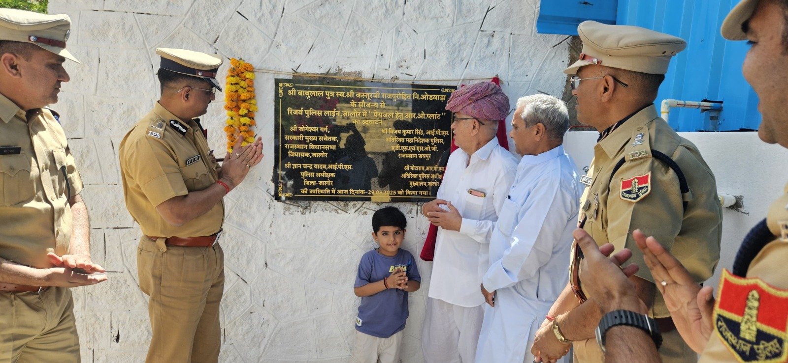 जालोर 29 मार्च। जिला मुख्यालय पर स्थित रिजर्व पुलिस लाईन जालोर में शनिवार को राजस्थान विधानसभा के मुख्य सचेतक जोगेश्वर गर्ग व अतिरिक्त महानिदेशक, पुलिस एसओजी एवं एटीएस विजय कुमार सिंह की उपस्थिति में ओडवाड़ा निवासी भामाशाह बाबुलाल पुत्र कस्तुरजी राजपुरोहित के सौजन्य से निर्मित आर.ओ. प्लांट का उद्घाटन किया गया।इस अवसर पर जिला पुलिस अधीक्षक ज्ञानचन्द्र यादव, अतिरिक्त पुलिस अधीक्षक मोटाराम गोदारा, भामाशाह परिवार के सदस्य एवं पुलिसकर्मी उपस्थित रहे।