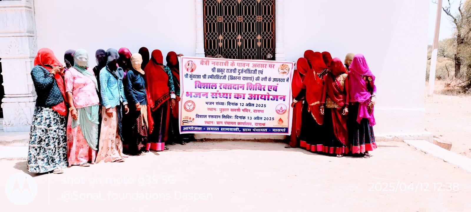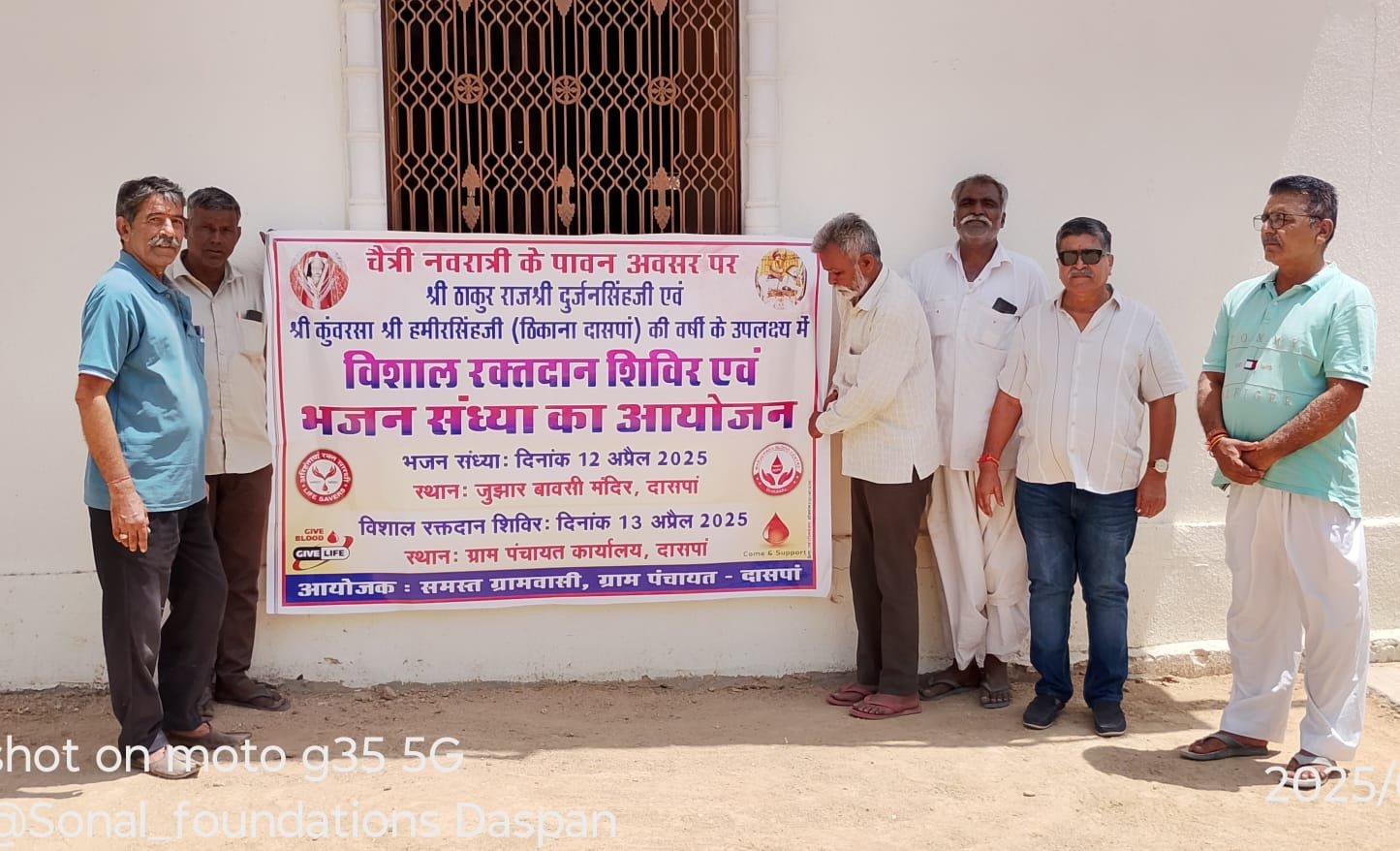 दासपां/भीनमाल-12 अप्रैल 2025 बैनर विमोचन एवं रक्तदान शिविर आयोजन चैत्र नवरात्रि के पावन अवसर पर श्री ठाकुर राजश्री दुर्जनसिंहजी एवं श्री कुंवरसा हमीरसिंहजी (ठिकाना दासपा) की वर्षी के उपलक्ष्य में विशाल रक्तदान शिविर एवं भजन संध्या का भव्य आयोजन किया जा रहा है।इस क्रम में आज दिनांक 12 अप्रैल को जुझार बावसी के वार्षिक आयोजन एवं आगामी रक्तदान शिविर के प्रचार हेतु बैनर का विधिवत विमोचन किया गया। इस अवसर पर समाजसेवा और जनकल्याण के क्षेत्र में अग्रणी अनेक गणमान्य जन उपस्थित रहे। बैनर विमोचन समारोह में उपस्थित प्रमुख गणमान्यजन- श्री विरेन्द्रसिंहजी चंपावत (सरपंच, दासपां)