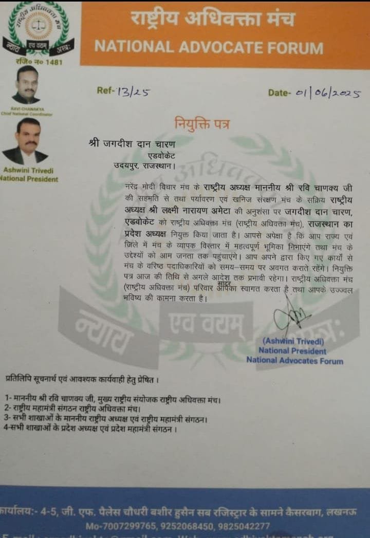 जगदीश दान चारण एडवोकेट उदयपुर,राजस्थान को नरेन्द्र मोदी विचार मंच के राष्ट्रीय अध्यक्ष माननीय श्री रवि चाणक्य जी के सहमति से तथा पर्यावरण एवं खनिज संरक्षण मंच के सक्रिय राष्ट्रीय अध्यक्ष लक्ष्मी नारायण अमेटा की अनुशंसा पर जगदीश दान चारण एडवोकेट को राष्ट्रीय अधिवक्ता मंच राजस्थान का प्रदेश अध्यक्ष नियुक्त किया गया है दिनांक 01/06/2025 को राज्य व जिले के व्यापक विस्तार व मंच की महत्व पूर्ण जिम्मेदारी निभाने व मंच की बात को जनता तक पहुंचाने जनता के कार्य को वरिष्ठ अधिकारी तक मंच की बात रखने के लिए बड़ी जिम्मेदारी मिली।