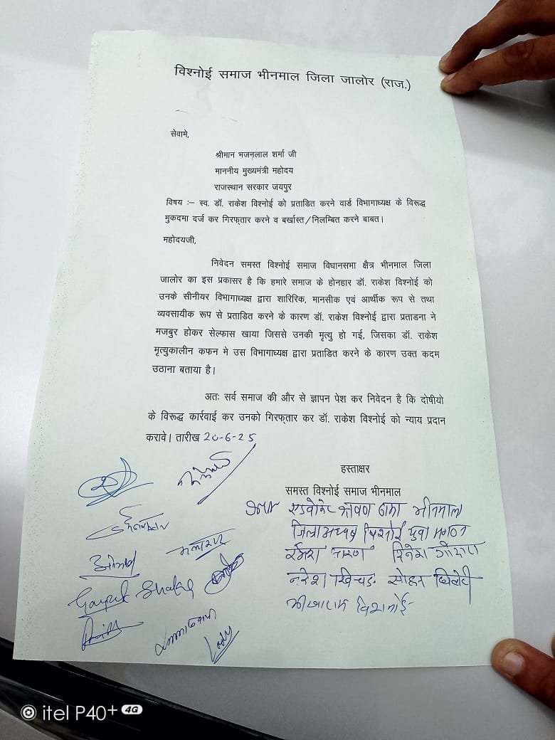 विश्नोई युवा जिलाअध्यक्ष एडवोकेट श्रवण ढाका ने बताया की मामला डॉ. राकेश विश्नोई की आत्महत्या से जुड़ा है। समाज का आरोप है कि डॉ. राकेश विश्नोई को उनके विभागाध्यक्ष ने शारीरिक, मानसिक और आर्थिक रूप से प्रताड़ित किया। इस प्रताड़ना से परेशान होकर डॉ. विश्नोई ने सेल्फास खाकर आत्महत्या कर ली। मृत्यु से पहले डॉ. राकेश ने अपने मृत्युकालीन बयान में विभागाध्यक्ष द्वारा की गई प्रताड़ना को आत्महत्या का कारण बताया। विश्नोई समाज ने मुख्यमंत्री से दोषी विभागाध्यक्ष के खिलाफ कार्रवाई की मांग की है।समाज की ओर से दी गई शिकायत में विभागाध्यक्ष को गिरफ्तार करने और उसे बर्खास्त या निलंबित करने की मांग की गई है। विश्नोई समाज ने डॉ. राकेश को न्याय दिलाने की गुहार लगाई है। इस अवसर पर इस अवसर पर युवा संगठन जिला अध्यक्ष एडवोकेट श्रवण ढाका,ट्रस्ट सचिव शिवनारायण बिशनोई,
