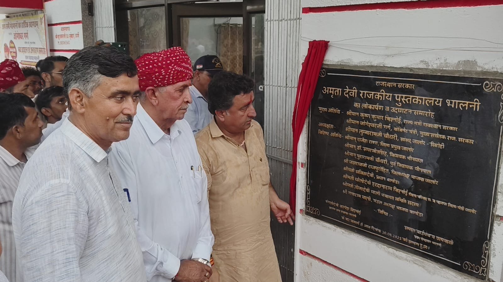 भालनी/ बागोड़ा-राज्य के उद्योग एवं वाणिज्य, युवा मामले एवं खेल, कौशल, नियोजन, उद्यमिता एवं नीति निर्धारण विभाग राज्य मंत्री के.के.विश्नोई, सांसद लुम्बाराम चौधरी व जसराज राजपुरोहित ने शनिवार को भीनमाल पंचायत समिति की भालनी ग्राम पंचायत के नवनिर्मित भवन व अमृता देवी राजकीय पुस्तकालय का विधिवत् रूप से फीता काटकर लोकार्पण किया। इसके साथ ही राजकीय उच्च माध्यमिक विद्यालय भालनी में दो कक्षा-कक्ष मय हॉल का उद्घाटन व गौ माता चौक पर मूर्ति अनावरण भी किया गया।