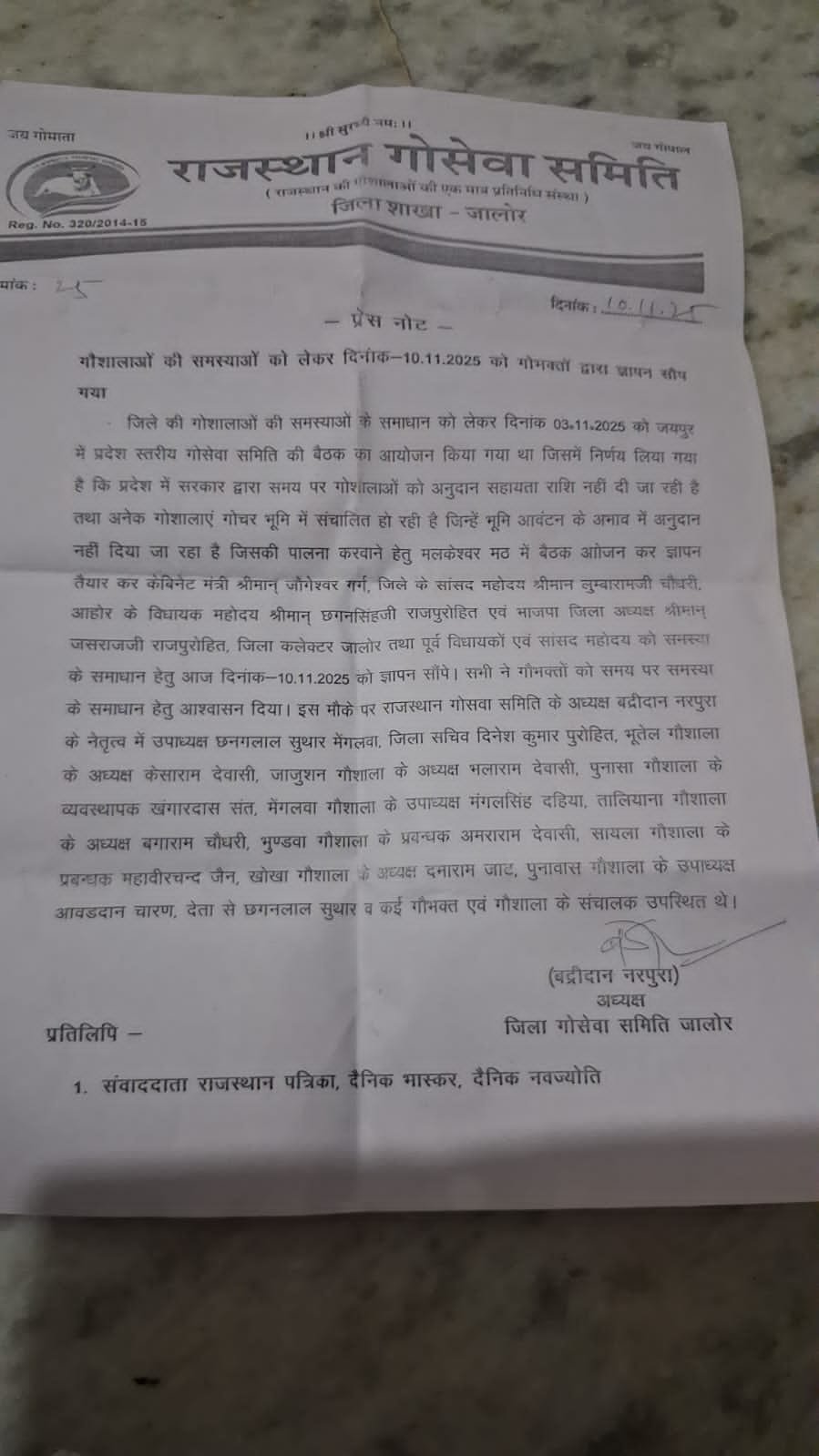 जालोर– जिले की गौशालाओं की विभिन्न समस्याओं के समाधान की मांग को लेकर आज गौभक्तों द्वारा ज्ञापन सौंपा गया। इससे पूर्व 3 नवम्बर 2025 को जयपुर में प्रदेश स्तरीय गोसेवा समिति की बैठक आयोजित की गई थी, जिसमें यह निर्णय लिया गया कि प्रदेशभर में संचालित गौशालाओं को सरकार द्वारा समय पर अनुदान सहायता राशि नहीं दी जा रही है। साथ ही कई गौशालाएं गोचर भूमि पर संचालित होने के कारण भुमि आवंटन के अभाव में अनुदान से वंचित हैं।इन समस्याओं को लेकर आज मलकेश्वर मठ में एक बैठक आयोजित की गई, जिसमें ज्ञापन तैयार कर जिला प्रशासन सहित जनप्रतिनिधियों को सौंपा गया। ज्ञापन के माध्यम से मांग की गई कि सरकार शीघ्र ही गौशालाओं को अनुदान राशि उपलब्ध करवाए और मूनि आवंटन से संबंधित बाधाओं का समाधान करे।गौभक्तों ने यह ज्ञापन केबिनेट मंत्री श्री जोगेश्वर गर्ग, सांसद श्री लुम्बाराम चौधरी, आहोर विधायक श्री छगनसिंह राजपुरोहित, भाजपा जिला अध्यक्ष श्री जसराज राजपुरोहित, जिला कलेक्टर जालोर सहित अन्य जनप्रतिनिधियों को सौंपा। सभी ने गौभक्तों को शीघ्र समाधान का आश्वासन दिया।इस मौके पर राजस्थान गोसेवा समिति के अध्यक्ष बद्रीदान नरपुरा के नेतृत्व में उपाध्यक्ष छनगलाल सुथार (मेंगलवा), जिला सचिव दिनेश कुमार पुरोहित, भूतेल गौशाला अध्यक्ष केसाराम देवासी, जाजुशन गौशाला अध्यक्ष भलाराम देवासी, पुनासा गौशाला व्यवस्थापक खंगारदास संत, मेंगलवा गौशाला उपाध्यक्ष मंगलसिंह दहिया, तालियाना गौशाला अध्यक्ष बगाराम चौधरी, भुण्डवा गौशाला प्रबंधक अमराराम देवासी, सायला गौशाला प्रबंधक महावीरचन्द जैन, खोखा गौशाला अध्यक्ष दनाराम जाट, पुनावास गौशाला उपाध्यक्ष आवडदान चारण, देता से छगनलाल सुथार सहित अनेक गौभक्त एवं गौशाला संचालक उपस्थित रहे.