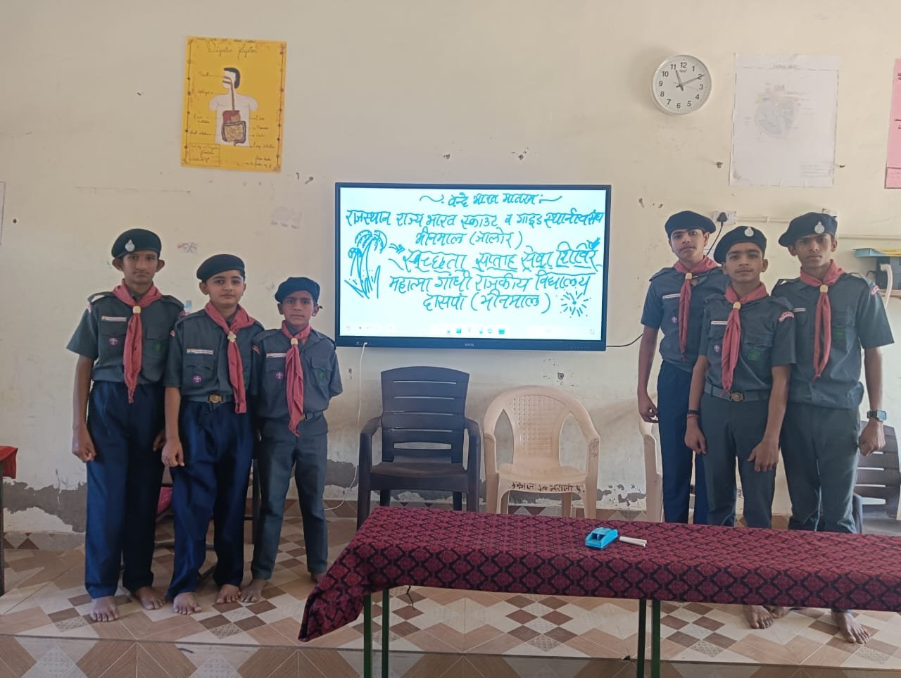 दासंपा/भीनमाल-भारत स्काउट गाइड के आयोजन अनुशासन की प्रथम सीढ़ी भीनमाल के निकट दासपा में महात्मा गांधी राजकीय विद्यालय, दासपां,जालोर में राजस्थान राज्य भारत स्काउट एवं गाइड स्थानीय संघ भीनमाल के तत्वावधान में सरकार व शिक्षा विभाग की मंशा अनुरूप सवाई सिंह राठौड़ सी ओ,गजेंद्र देवासी मुख्य ब्लॉक शिक्षा अधिकारी,निंबाराम चौधरी,जगदीश प्रसाद जीनगर प्राचार्य के निर्देशानुसार श्रीमती नीलम चौधरी प्राचार्या,बिच्छूसिंह शिक्षाविद के सानिध्य में स्वच्छता शिविर का आयोजन किया गया। शिविर का मूल उद्देश्य विद्यार्थियों एवं समुदाय में स्वच्छता के प्रति जागरूकता बढ़ाना और स्वच्छ आदतों को दैनिक जीवन का हिस्सा बनाना रहा। शिविर में स्काउट के भीनमाल ब्लॉक के सचिव डॉ घनश्याम व्यास ने विद्यार्थियों को स्वच्छता की महत्ता से अवगत करवाते हुए विद्यालय,घर तथा आस-पास के वातावरण को स्वच्छ रखने का संदेश दिया। संस्था प्रधान श्रीमती नीलम चौधरी ने कहा कि स्वच्छ आदतें न केवल स्वास्थ्य की रक्षा करती हैं,बल्कि व्यक्तित्व निर्माण में भी महत्वपूर्ण भूमिका निभाती हैं।इस अवसर पर स्काउट सह सचिव श्रवण कुमार सोलंकी,