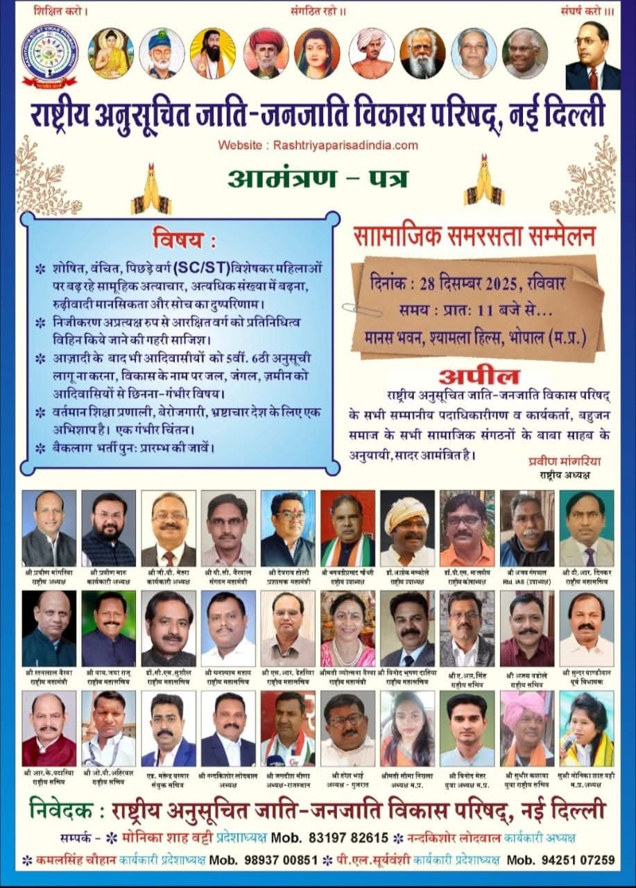 राष्ट्रीय अनुसूचित जाति जनजाति विकास परिषद का समरसता कार्यक्रम 28 दिसंबर को भोपाल में