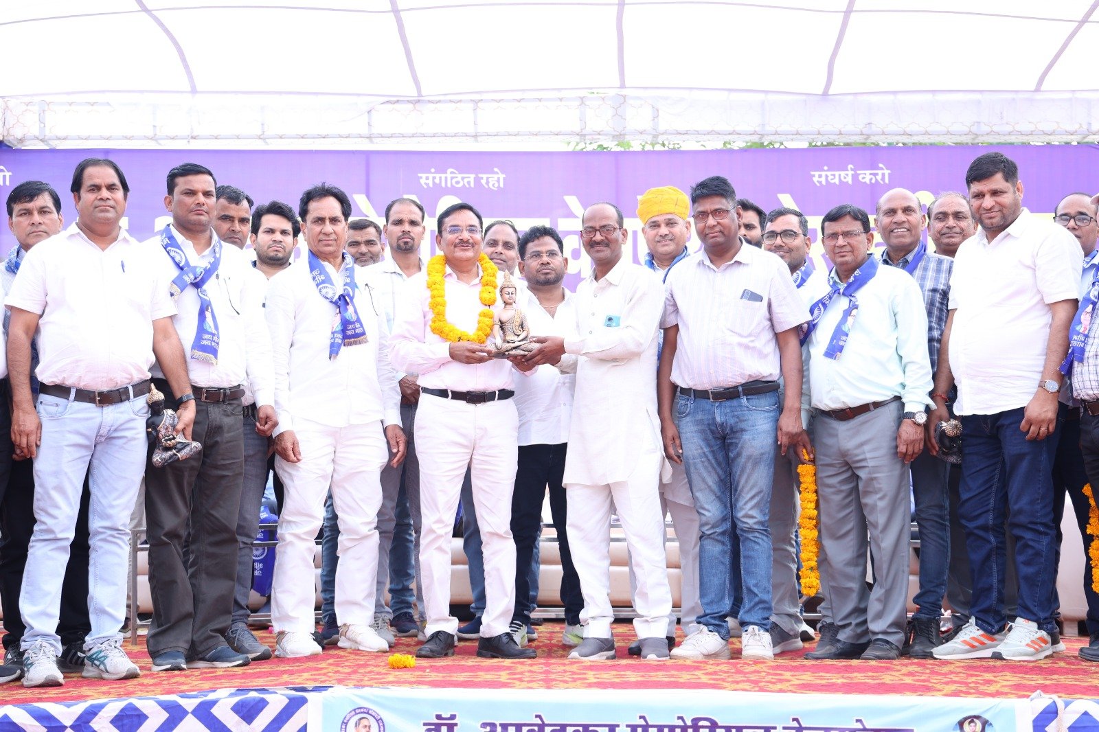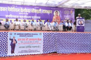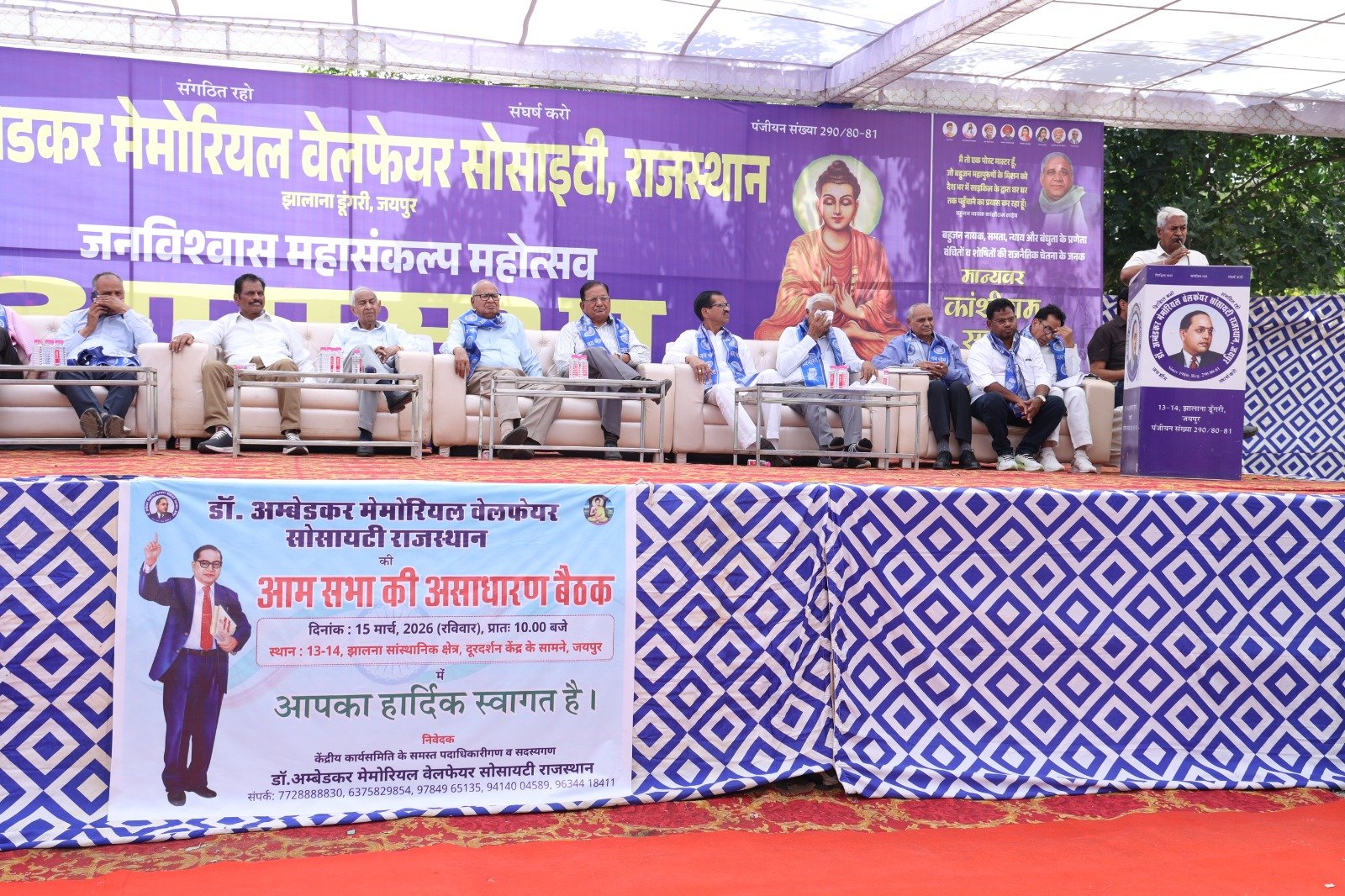 जयपुर-डॉ अंबेडकर मेमोरियल वेलफेयर सोसाइटी, जयपुर द्वारा आयोजित प्रदेश स्तरीय आम सभा एवं मान्यवर कांशीराम साहेब की 92 वीं जयंती समारोह का आयोजन अत्यंत गरिमामय वातावरण में संपन्न हुआ। कार्यक्रम का शुभारंभ बाबा साहेब डॉ. भीमराव अंबेडकर एवं मान्यवर कांशीराम जी के चित्र पर माल्यार्पण कर किया गया।इस अवसर पर पूर्व अध्यक्ष पी सी हाड़ियां, पूर्व आईएएस बी.एल. आर्य, पूर्व डीजीपी के.एल. बैरवा, पूर्व आईएएस बी.एल. नवल, अजाक प्रदेशाध्यक्ष श्री राम चोरड़िया, पूर्व अध्यक्ष बी.एल. बैरवा, पूर्व अध्यक्ष जे.पी. विमल, पूर्व आईपीएस जय नारायण शेर, पूर्व जज टेक चंद राहुल, संस्था की वर्तमान केंद्रीय कार्यसमिति के अध्यक्ष एवं पूर्व आईपीएस सत्यवीर सिंह, उपाध्यक्ष रामेश्वर प्रसाद बैरवा, महासचिव डॉ. चेतराम रायपुरिया तथा कोषाध्यक्ष दयानंद शक्करवाल सहित अनेक विशिष्ट अतिथि उपस्थित रहे।कार्यक्रम में प्रदेश भर से आए जिलाध्यक्षों द्वारा सभी अतिथियों का भीम दुपट्टा पहनाकर भव्य स्वागत किया गया। उपाध्यक्ष रामेश्वर प्रसाद बैरवा ने स्वागत भाषण देते हुए संगठन की गतिविधियों और उद्देश्यों पर प्रकाश डाला। इसके पश्चात प्रदेश के विभिन्न जिलाध्यक्षों ने संगठन के विस्तार, सामाजिक सरोकारों और भविष्य की योजनाओं पर अपने विचार व्यक्त किए।महासचिव डॉ. चेतराम रायपुरिया ने संविधान संशोधन से संबंधित विभिन्न प्रस्तावों को आम सभा के समक्ष प्रस्तुत किया, जिन्हें ध्वनिमत से पारित किया गया। इसके उपरांत निर्माण समिति के अध्यक्ष सुरेन्द्र बेरी ने संस्था परिसर के आगामी निर्माण कार्यों से संबंधित विस्तृत डीपीआर सभा के समक्ष प्रस्तुत किया।संस्था के अध्यक्ष एवं पूर्व आईपीएस सत्यवीर सिंह ने अपने अध्यक्षीय भाषण मे कांशीराम साहेब के जन्म दिवस पर उनके पे बैक टू सोसाइटी के आह्वान से प्रेरित होकर संस्था के विकास के लिए एक कमरे के निर्माण की घोषणा की, साथ ही उन्होंने उपस्थित साथियों से भी इस दिशा में योगदान करने के लिए प्रेरित किया, तो उनके आह्वान पर सभा में उपस्थित सदस्यों द्वारा उसी समय लगभग पचास कमरों के निर्माण मे सहयोग की घोषणा की गई।कार्यक्रम के दौरान संस्था के कोषाध्यक्ष दयानंद शक्करवाल ने आगामी वित्तीय वर्षों का लेखा-जोखा एवं प्रस्तावित बजट सभा के समक्ष प्रस्तुत किया। इस प्रदेश स्तरीय आम सभा में प्रदेश भर से आए हजारों सदस्यों की उल्लेखनीय उपस्थिति रही।कार्यक्रम का सफल संचालन जयपुर जिलाध्यक्ष विनोद वर्मा रलावता द्वारा किया गया।