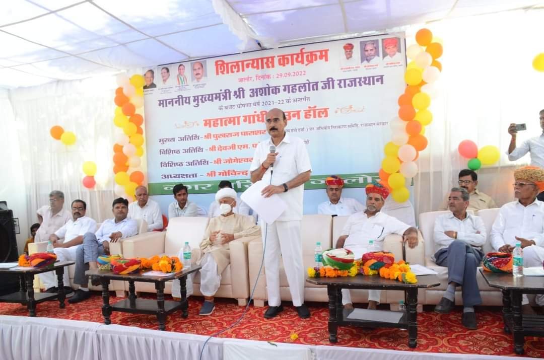 जालौर ।राज्य सरकार की बजट घोषणा के अनुसरण में जालोर शहर में 17 करोड़ की लागत से निर्मित होने वाले महात्मा गांधी टाउन हॉल का शिलान्यास गुरूवार को भीनमाल रोड़ पर जन अभियोग निराकरण समिति के अध्यक्ष पुखराज पाराशर ने किया।नगरपरिषद जालोर के आयुक्त महिपाल सिंह ने बताया कि मुख्यमंत्री बजट घोषणा वित्तीय वर्ष 2021-22 के अन्तर्गत स्वीकृत कार्य महात्मा गांधी टाउन हॉल का शिलान्यास गुरूवार को परिवहन विभाग के पास, भीनमाल रोड़ पर आयोजित हुआ जिसमें मुख्य अतिथि के रूप में जन अभियोग निराकरण समिति के अध्यक्ष पुखराज पाराशर व श्रम राज्य मंत्री सुखराम विश्नोई एवं विशिष्ट अतिथि के रूप में जालोर विधायक जोगेश्वर गर्ग, जिला कलक्टर निशान्त जैन,