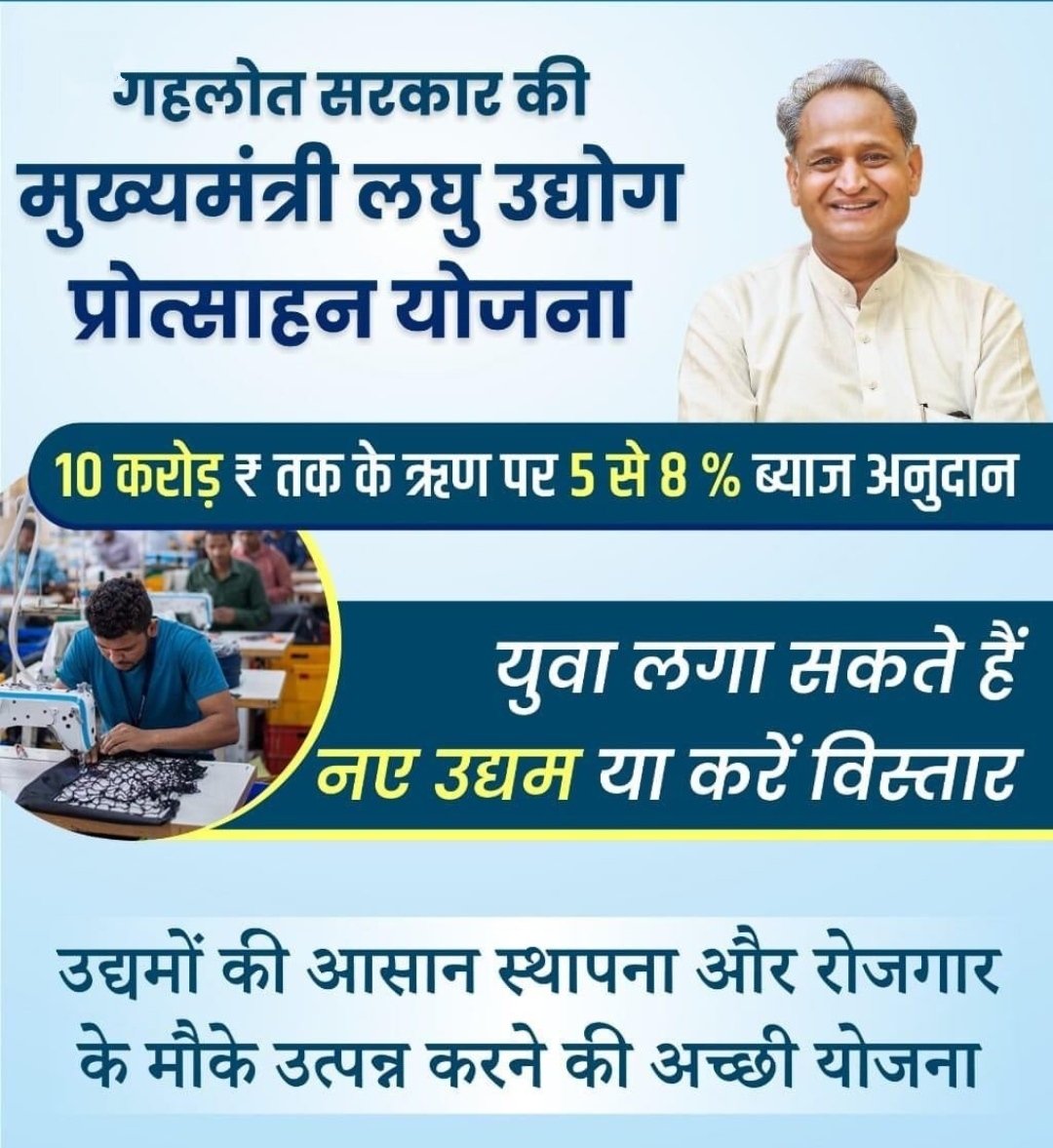 जिला उद्योग एवं वाणिज्य केन्द्र के महाप्रबंधक संग्रामराम देवासी ने बताया कि राज्य में उद्योगों की सरल स्थापना एवं रोजगार के नये अवसर उपलब्ध करवाने के लिए ब्याज अनुदान युक्त ऋण उपलब्ध करवाने के लिए ब्याज अनुदान युक्त ऋण उपलब्ध करवाने, स्वयं के उद्यम (विनिर्माण, सेवा एवं व्यापार) की स्थापना तथा स्थापित उद्यम के विस्तार, विविधिकरण व आधुनिकीकरण के लिए कम लागत पर मुख्यमंत्री लघु उद्योग प्रोत्साहन योजना के तहत ऋण उपलब्ध कराने एवं रोजगार के नवीन अवसरों का सृजन करना है। योजना 31 मार्च 2024 तक प्रभावी है।