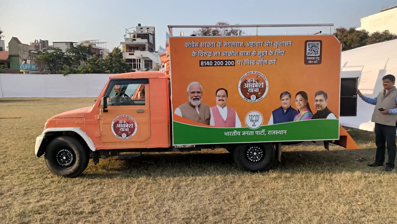 भाजपा द्वारा जिले की सभी विधानसभाओं के लिए जनाक्रोश रथों की लॉन्चिंग शुक्रवार को 10 बजे मलकेश्वर मठ से की जायेगी। भाजपा जिला मीडिया प्रभारी भावेश सोनी ने बताया कि रथ यात्रा लोंचिन कार्यक्रम में कार्यक्रम जन आक्रोश यात्रा जिला प्रभारी महंत प्रतापपूरी महाराज, जिला प्रभारी महेंद्र बोहरा, भाजपा जिलाध्यक्ष श्रवणसिंह राव, सांसद देवजी भाई पटेल, विधायक नारायणसिंह देवल, जोगेश्वेर गर्ग, छगनसिंह राजपुरोहित, पूराराम चौधरी, जिला प्रमुख राजेश राणा, नगर परिषद सभापति गोविंद टांक, पूर्व विधायक, पूर्व जिलाध्यक्ष एवं जिला पदाधिकारी, मोर्चो के जिलाध्यक्ष, मोर्चो के जिला पदाधिकारी, सभी मंडल प्रभारी, सभी मंडल अध्यक्ष, मंडल पदाधिकारी, प्रधान, जिला परिषद सदस्य, पंचायत समिति सदस्य, नगर पालिका पार्षद सहित समस्त भाजपा के वरिष्ठ पदाधिकारी और जनप्रतिनिधि उपस्थित रहेंगे।