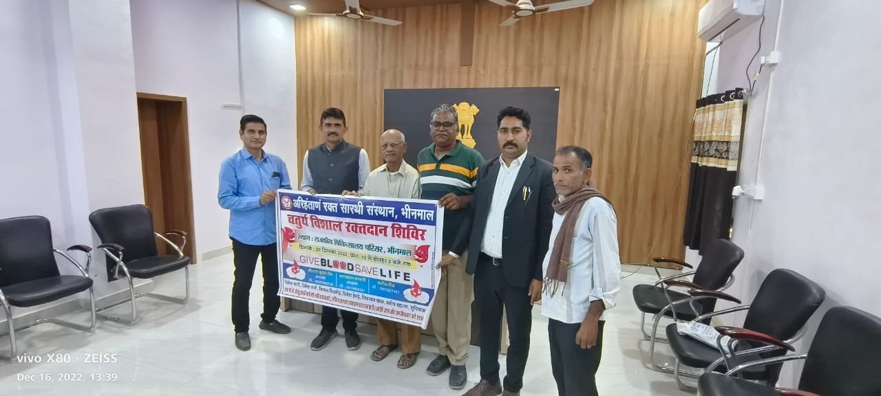 अरिहंताणं रक्त सारथी संस्थान की ओर से 20 दिसम्बर को आयोजित रक्त दान शिविर के बैनर-पोस्टर का विमोचन किया गया । अरिहंताणं रक्त सारथी संस्थान की ओर से बीस दिसम्बर को आयोजित रक्त दान शिविर के बैनर-पोस्टर का विमोचन उप खंड अधिकारी कार्यालय में किया गया । इस अवसर पर उप खंड अधिकारी जवाहरराम चौधरी, नागरिक कल्याण मंच के अध्यक्ष एवं जिले के वरिष्ठ पत्रकार माणकमल भंडारी, अरिहंताणं रक्त सारथी संस्थान के अध्यक्ष कैलाश जैन, आर डी फाउंडेशन के गजेन्द्रसिंह कारोला, एडवोकेट दिनेश हेगडे, पत्रकार ललित होंडा एवं मुकेश सोलंकी,