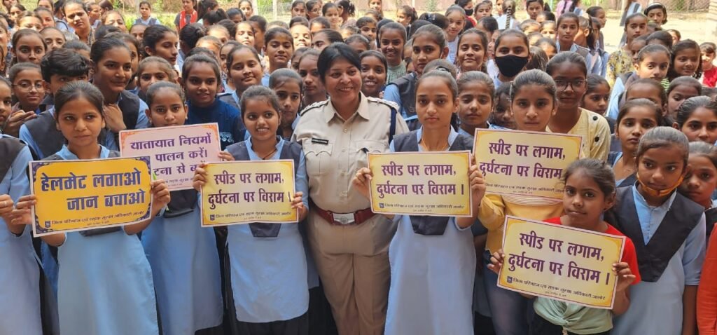सड़क सुरक्षा सप्ताह के दौरान बालिकाओं को यातायात नियमों की जानकारी दी।