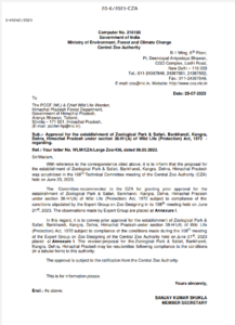 हिमाचल प्रदेश में बड़ा चिड़ियाघर स्थापित करने के लिए केन्द्रीय चिड़ियाघर प्राधिकरण (सी. जेड. ए.) से मिली पूर्व स्वीकृति।