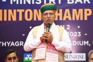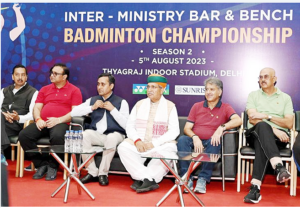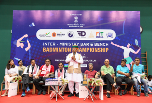 समाज में स्वस्थ जीवन शैली को बढ़ावा देने के अपने उद्देश्य को ध्यान में रखते हुए फिट इंडिया मिशन ने कानून और न्याय मंत्रालय के सहयोग से आज यहां त्यागराज खेल परिसर में अंतर-मंत्रालय बार एंड बेंच बैडमिंटन चैंपियनशिप के दूसरे संस्करण का आयोजन किया। इस टूर्नामेंट में न्यायाधीशों, वकीलों और भारत सरकार के अलग-अलग मंत्रालयों के अधिकारियों की उत्साहपूर्ण भागीदारी देखी गई। कार्यक्रम का उद्घाटन केंद्रीय कानून और न्याय मंत्री अर्जुन राम मेघवाल ने किया। इस अवसर पर उन्होंने पारंपरिक पोशाक पहनी हुई थी। कार्यक्रम में उनकी उत्साहपूर्ण भागीदारी रही। उन्होंने एक लघु प्रदर्शनी मैच में अपनी प्रभावशाली छाप छोड़ी।